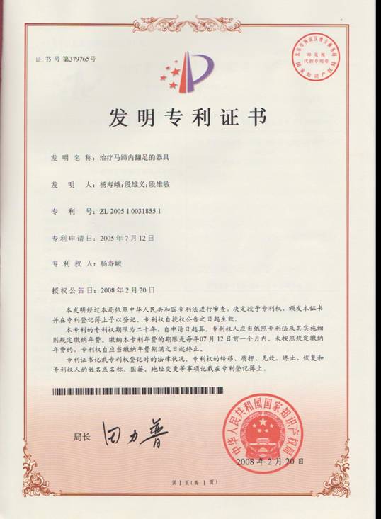 上一条:治疗马蹄内翻足关节的器具发明专利证书
