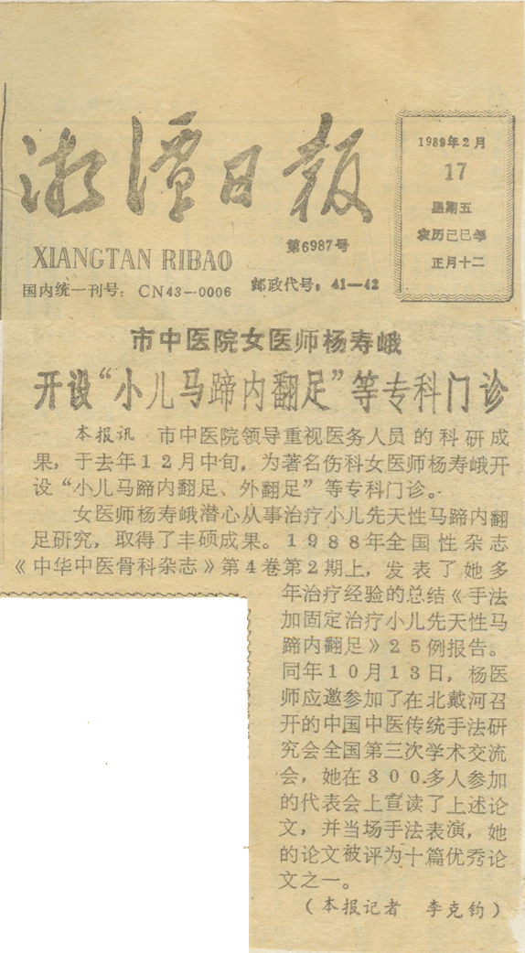 下一条:湖南妇女报(1988年11月3日)——治疗小儿先天性马蹄内翻足新方法